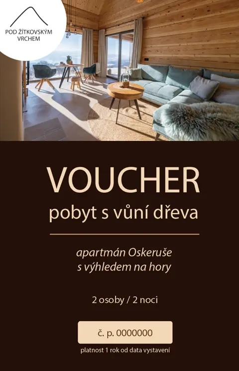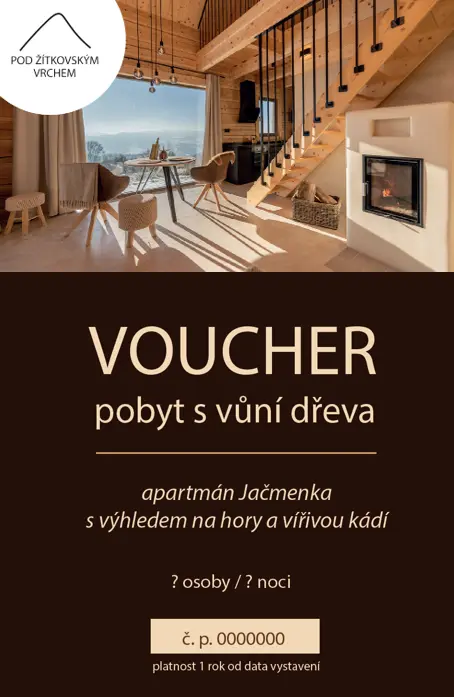 Udělejte radost svým blízkým. Voucher na víkendový pobyt v apartmánu Oskeruše s výhledem na hory za 8 772 Kč / 2 noci Voucher na víkendový pobyt v apartmánu Jačmenka s výhledem na hory a vířivou kádí za 9 977 Kč / 2 noci Voucher na víkendový wellness pobyt v apartmánu Jačmenka s výhledem na hory, vířivou kádí a vstupem do sauny za 12 177 Kč / 2 noci Nebo nám napište a my Vám vystavíme voucher na libovolnou částku :)